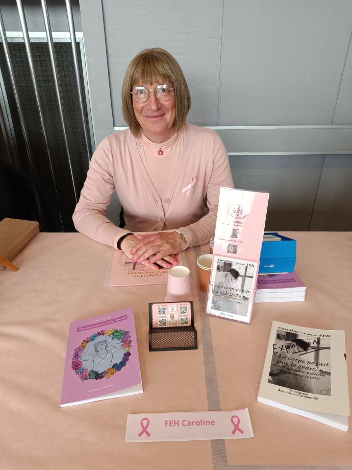 Le 20 octobre, vêtue de rose de haut en bas (sauf jupe et chaussures crème 😉), j'y étais présente, de 10 h à 18 h, à la Salle Honecker, située sur la place du même nom.