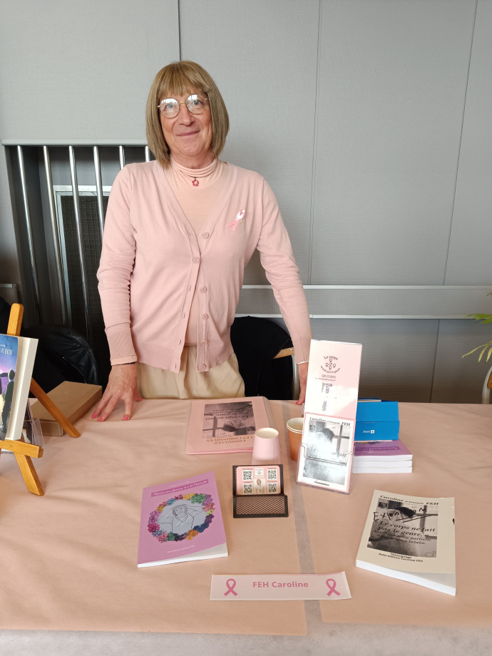 Le 20 octobre, vêtue de rose de haut en bas (sauf jupe et chaussures crème 😉), j'y étais présente, de 10 h à 18 h, à la Salle Honecker, située sur la place du même nom.